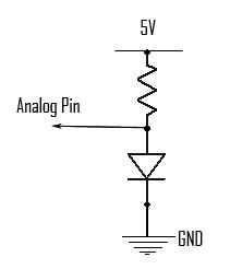El diodo y el resistor necesitan estar simplemente conectado en serie con un cable que viene de la Unión de los dos va al pin analógico de Arduino.