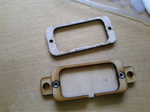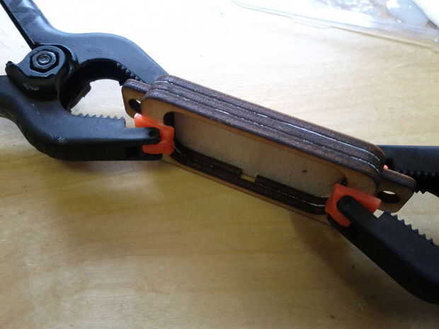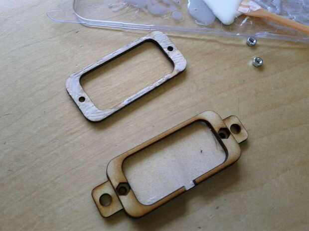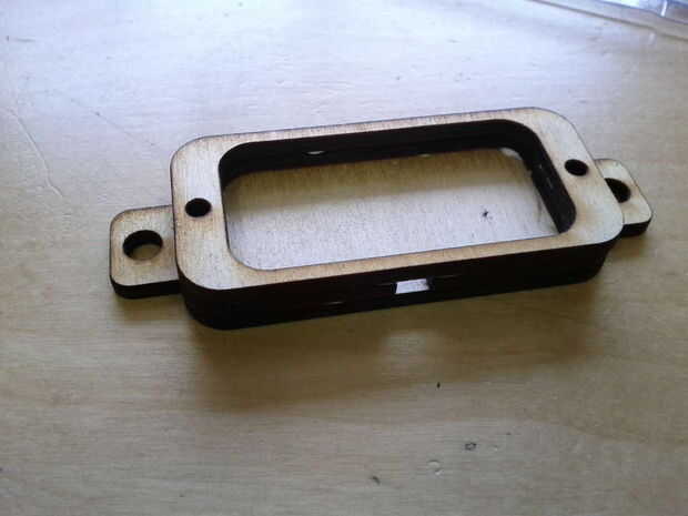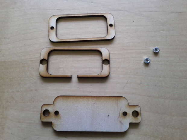 La caja está hecha de un montón de piezas de corte láser. Se pegan los tres inferiores y esto mantiene las dos tuercas de M3 en su lugar. Las dos piezas principales se llevan a cabo en lugar con los dos tornillos de M3. Esto significa que puede abrir la caja, por cualquier razón.