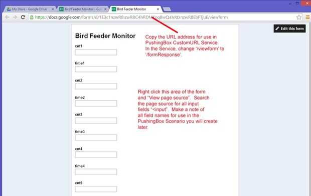 Para enviar datos de una hoja de cálculo de Google Docs, primero debe crear un formulario con todos los campos requeridos. En mi ejemplo, tengo seis campos 'cnt' y seis campos de 'time' que son de entrada de número entero. Por ejemplo, los campos se denominan 'cnt1', 'tiempo1', 'cnt2', 'tiempo2', etc.. Una vez su terminado con el formulario, haga clic en "Ver formulario vivo" para ver la forma final. Al ver el formulario, haga clic con el botón derecho la página y seleccionar "Ver código fuente de la página". Buscar y encontrar todos los campos "input" de HTML en el código fuente. Tome nota del nombre de cada uno de los campos que escribiste en el formulario. Esta información es necesaria para crear su escenario en PushingBox.