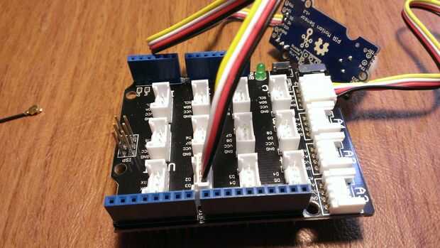 Entonces, tienes que conectar el sensor de los sonidos en A0 (porque es analógico) y el Sensor de movimiento a D2. Esto debe hacerse muy fácilmente como los sensores de Grove son simplemente plug-in-play.