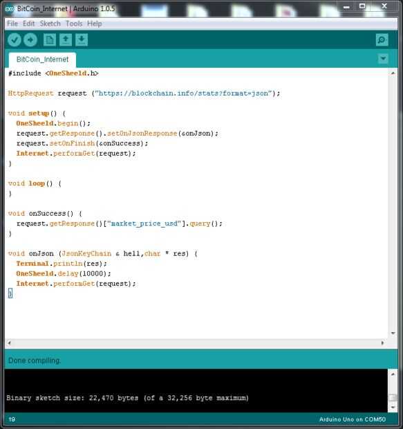 #include <OneSheeld.h> HttpRequest request ("https://blockchain.info/stats?format=json"); void setup() { OneSheeld.begin(); request.getResponse().setOnJsonResponse(&onJson); request.setOnFinish(&onFinish); Internet.performGet(request); } void loop() { } void onFinish() { request.getResponse()["market_price_usd"].query(); } void onJson (JsonKeyChain & hell,char * res) { Terminal.println(res); OneSheeld.delay(10000); Internet.performGet(request); } El siguiente paso es agregar la parte de la matriz de LCD. Todas las matrices definidas en la primera son los marcos para obtener el número con su ubicación en el precio del Bitcoin. Sé que suena para ser tan confuso pero nos discus pero si tienes tu propia matriz de LED en alguien se puede utilizar, usted puede simplemente omitir esta parte.