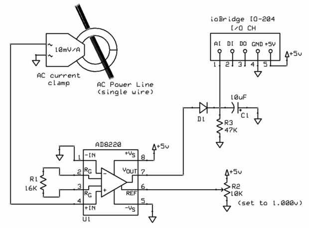 La otra parte del circuito es un detector de pico agujereado con un diodo, el resistor y el condensador. Su propósito es traducir los picos de la onda de AC a un nivel de voltaje de DC. La resistencia de 47 k causa la filtración. Puesto que el nivel de voltaje actualiza 60 veces por segundo, añadiendo que resistor aumenta el tiempo de respuesta del sistema.
