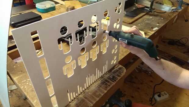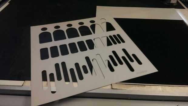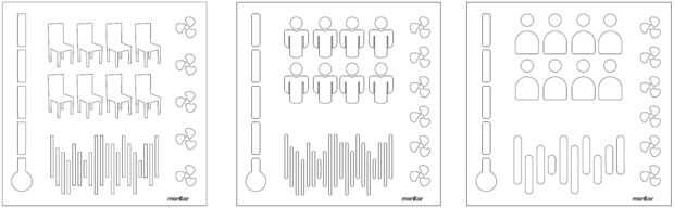 El MONITOR es un panel de madera retroiluminado molido símbolos en él. Una capa de vidrio esmerilado separa la madera frontal y los LEDs y difunde su luz. Ya que se podría utilizar la tecnología para mostrar literaria cualquier información necesita primero diseñar el panel delantero y la alineación de los símbolos brillantes. Nota: Hacer después de conseguir sus manos en la tira de LED ya que las piezas tienen ciertas dimensiones que no se pueden superponer a la hora de colocación. Cuando se conoce las dimensiones exactas de las piezas de LED se podía iniciar colocación de los símbolos. En nuestro caso utilizamos Nemetschek Allplan para los dibujos de CAD. Por supuesto hay alternativas de CAD gratuitas aquí. Nuestro panel tiene 4 grupos de información que describe las condiciones en la sala espacio compartido - temperatura, calidad de aire, ocupación y nivel de ruido.