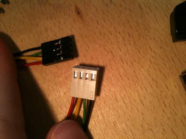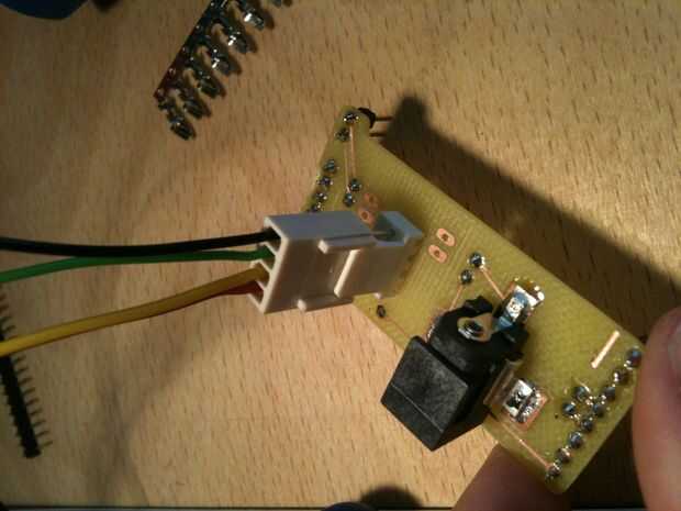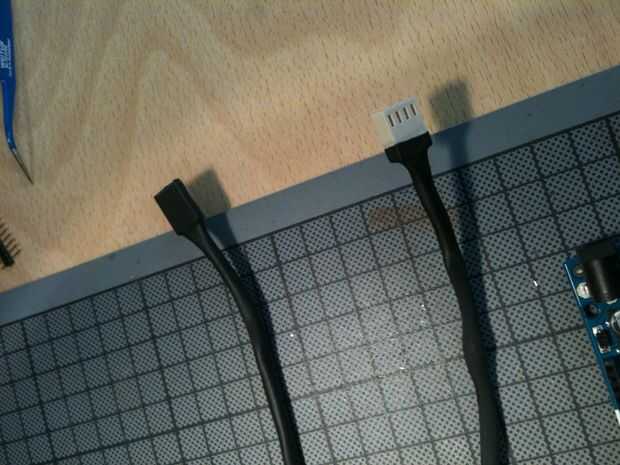 tiene que estar conectado a la halfshield. Tirar sobre el tubo retráctil antes de comenzar con el segundo final. Soldar dos cables al conector macho y la hembra a los 5V y entrada GND de la primera ledsegment que pertenece al sonido. Asegúrese de que no cambiar los cables en el cable nuevo! El cable de la tira del LED utiliza el PSK con 4 ranuras. El extremo que tiene que estar conectado a arduino, es una mujer. Si la placa arduino puntos a usted con el lado analógico pins tiene de izquierda a derecha - GND, DI, CI, 5V. El otro extremo se conecta a la cabecera de la encrespadura.