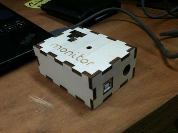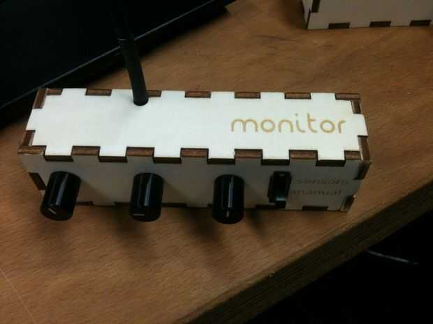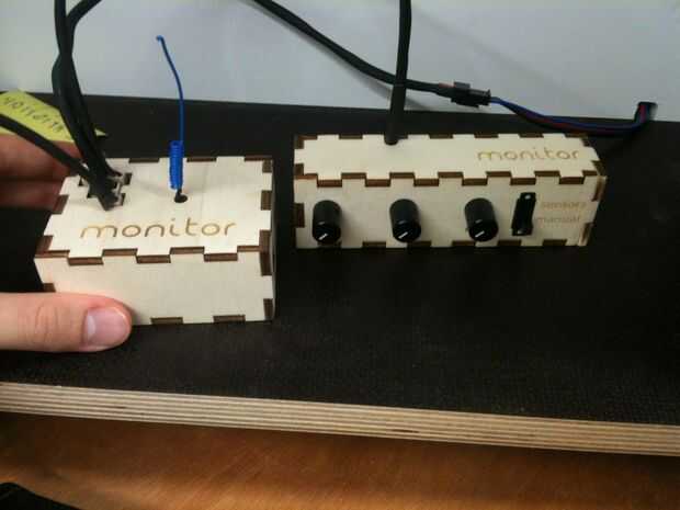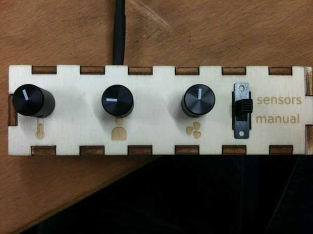 El cuadro, bueno, es un poco innecesario para este proyecto porque realmente quieres sensores inalámbricos para alimentar los datos. Pero se ve muy cool y quería usar el cortador del laser. El archivo necesario para esta caja se denomina PotiBox.svg y se puede abrir con el software gratuito Inkscape. El cuadro es generar con Boxmaker (W: 124 mm, H: 38 mm, D: 42 mm, MT: 4 mm). He añadido los agujeros para los potenciómetros y el interruptor de tirón. Además usé un cuadro de texto para la fuente y las imágenes de los tres símbolos. Cortar la parte delantera en dos puestos de trabajo. Primero corte las líneas negras con la configuración estándar de 4mm pappel y había grabado de la fuente de color rojo con intensidad de 40 por ciento. En segundo lugar había grabado las imágenes con la misma intensidad. Esto tiene que fijarse hasta en el programa para el cortador del laser (Visicut por ejemplo). Uso pegamento para madera normal y algunos restos para armar la caja y fije la tarjeta en el lugar. Ahora puede insertar el interruptor de tirón. Partido el cable del pin por la mitad y la soldadura de una mitad con el conector medio del interruptor y el otro al pin de arriba. Enchufe el cable, que está conectado con el perno superior para el enchufe al lado del potenciómetro y el otro a su lado. Todo menos el elemento superior junto por lo tanto, todavía puedo quitar el cable de la caja pegué.
