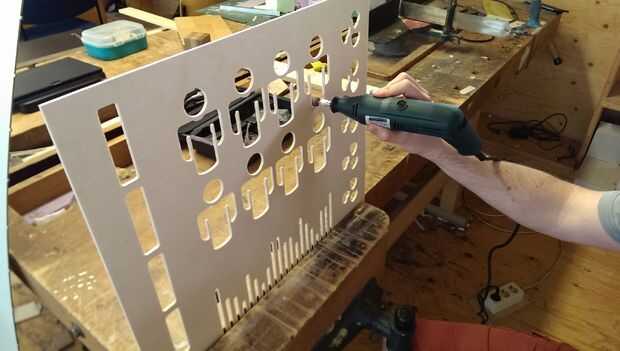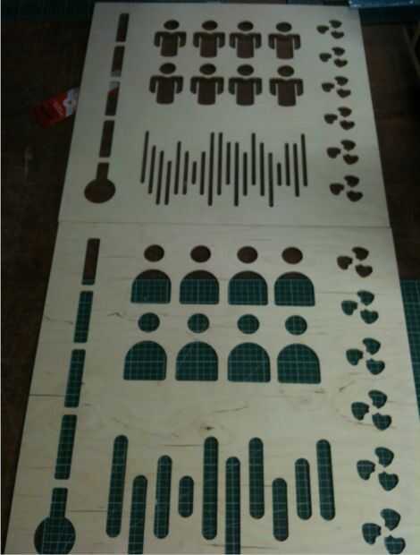 Utilizamos una miling máquina CNC para cortar nuestros símbolos en una placa de multiplex con una agradable textura madera. Básicamente se puede utilizar cualquier cosa, desde plástico a metal para el panel frontal. El archivo CAD se llama MONITOR.dwg.