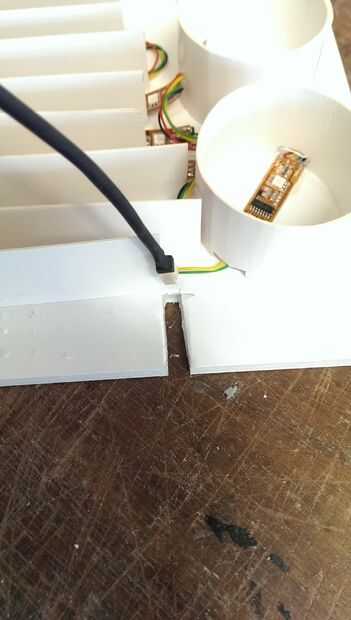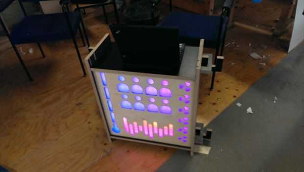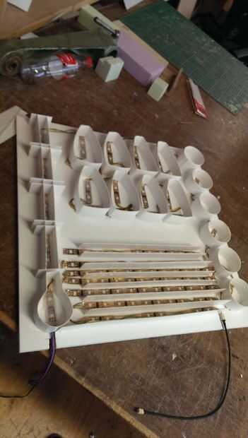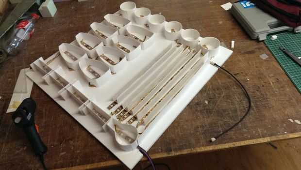 Después de tener todo en la forma correcta, que se podría proceder a finalizar el panel haciendo una cara apropiada para él. El marco era un 17mm espesor Multiplex de 563 x 562 mm. Que tallamos una ranura de 7 mm x 7 mm en el marco para que nosotros pudiéramos deslizante en el panel frontal y el panel con las luces. Con el fin de obtener la luz sea difusa colocamos un opalino de 3 mm espesor plexiglas. Para mejores resultados consulte este.