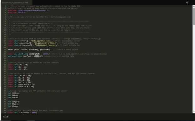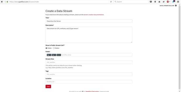 En primer lugar, establecer una secuencia de datos en [servicio de data.sparkfun.com] (http://data.sparkfun.com). A continuación, escriba un programa para leer el valor analógico de cada sensor de gas, convertir a PPM y cotejar con los umbrales seguros conocidos. Basado en normas de seguridad OSHA, los umbrales para los tres gases son las siguientes: