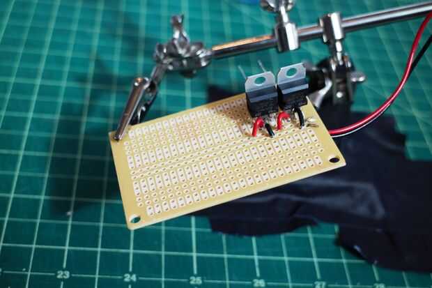 2. tres reguladores de voltaje para el tablero del PWB de la soldadura. Para cada regulador, conecte la salida del positivo de la batería a la entrada del regulador y conecte el pasador del regulador de voltaje medio a tierra.