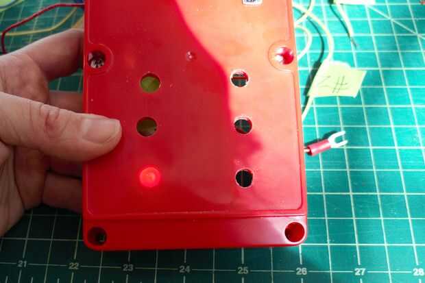 2. Taladre 3 agujeros en la tapa del caso para las luces a brillar a través y con 3 agujeros para los sensores de gas para aire. Se adhieren a los componentes en el interior de la tapa.