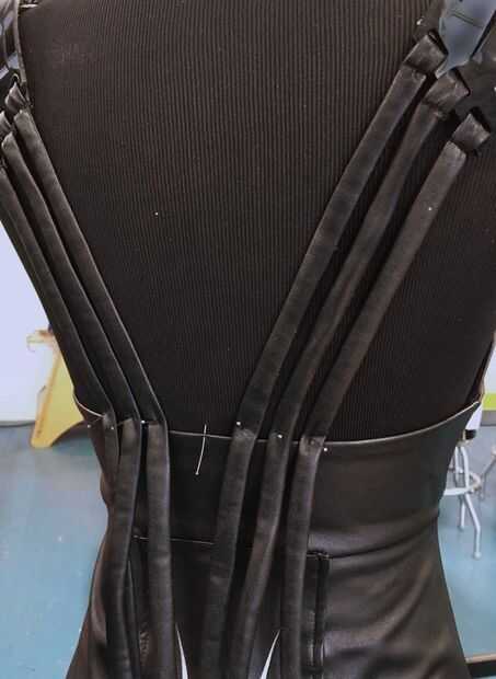 Ahora poner el vestido y la pieza superior sobre el maniquí y averiguar donde usted quiere colocar las bandas. Abra cuidadosamente las costuras en la zona, así como las costuras de la cintura detrás de la bolsa de batería (capa superior y guarnición). Ahora alimentar tiras de la tela aunque el forro y la parte superior de la capa para que las tiras salen a través de la costura de la cintura. Prender las tiras con el largo deseado en la posición correcta y cerrar sólo la costura superior por ahora.