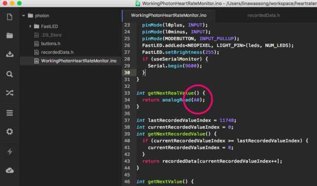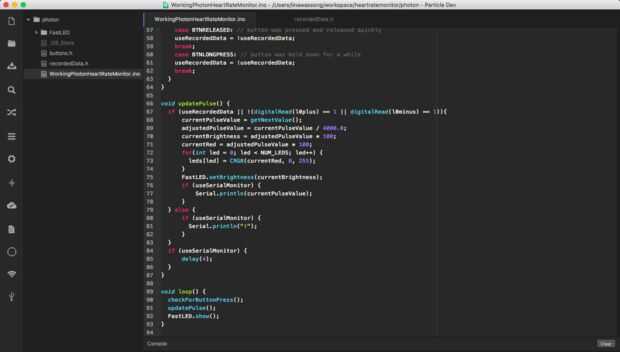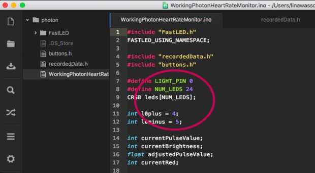 Seguir adelante y abrir partícula Dev y elija archivo > abrir... en el menú desplegable. Desplácese a la carpeta de fotón y haga clic en abrir. En el lado izquierdo, haga clic en WorkingPhotonHeartRateMonitor.ino para abrir el código. Ahora cambiar el número de LEDs definidos en el código para el número de LEDs que utilizas en tu proyecto.