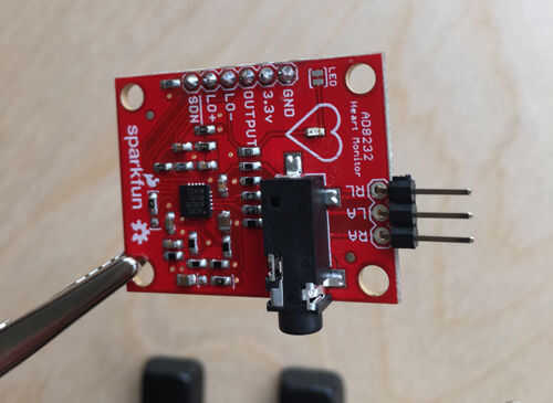 Para conectar nuestro personalizado e integrado-textil electrodos con la Junta y no los voluminosos electrodos pegajosos, suelde una cabecera en cada uno de los RA (brazo derecho), LA (brazo izquierdo) y RL (pierna derecha) pernos en la Junta.