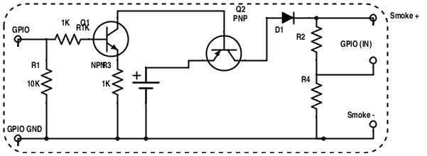 He atado con alambre detectores de humos en mi casa y se conectan de manera que si una alarma suena, que todo sonido, es la manera que lo hacen enviando un 9V señalan en el cable 3. Si envía los 9V de la RPI puedo encender los detectores de humo. No seguro por qué, quiero que simplemente porque puedo. Conecté los detectores de humo a la RPI recibe avisos cuando se apagan las alarmas de humo y también poder fijar apagado las alarmas del comando. Problema interesante con esta configuración. Cuando yo cierre mi servicio de monitoreo, alarmas de humo sonadas. Tuve una llamada GPIO.cleanup() en mi parada de programa. Al parecer limpieza convierte todos los pines GPIO para clavijas de entrada. Al parecer esto hace que la tensión en el GPIO para ir alta. He quitado la llamada limpieza y tuvieron que instalar GPIO para ignorar los avisos de GPIO en uso. Terminé creando mi propio nivelador lógica bidireccional. El circuito siguiente es lo que se me ocurrió después de googlear extensa otro circuito. Si alguien tiene un Comentario en mi circuito, me avisas. Me gustaría saber si hizo algo mal en el circuito.