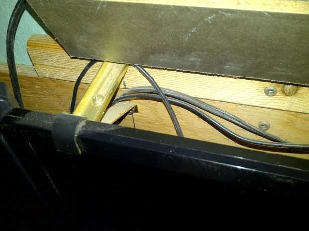 Mi pantalla de 19 pulgadas centro fue malo y yo bueno una buena oferta en este acer de 21 pulgadas, pero tiene agujeros de montaje de VESA NO! Así, que tuve que idear otra forma de montarlo. Lo que me ocurrió me costó nada, ya tuve algunos de estos soportes de barra de cortina en el cobertizo. Hay dos en la parte inferior, con los ganchos hacia arriba y dos en la parte superior con lo ganchos al revés. Todo va junto bastante fácilmente si ves en la parte superior de tornillo de cobre es la última parte se monta, con el borde inferior del monitor descansando en los ganchos de la parte inferior. Cinta aislante un poco oculta los soportes de latón feo, aunque la pintura (o incluso PlastiDip) probablemente hubiera sido aún mejor. Aquí puede ver que el panel de montaje original no fue lo suficientemente amplio como para esto, así que añadí una tira en la parte superior e inferior para dar cabida a los soportes.