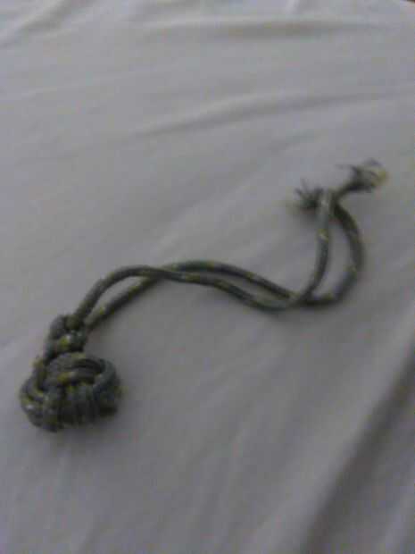 nuestro perro Dodger Ripea los juguetes del perro normal aparte en unos 15 minutos. "Juguetes indestructible" toman un poco más ;)Aprendí cómo hacer un nudo de puño de mono en un festival malabares unos años--hice a Dodgers un juguete de cuerda