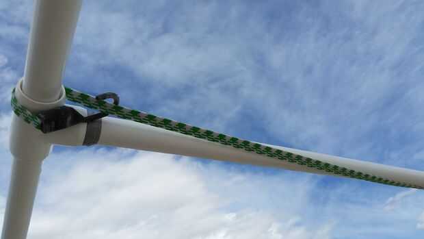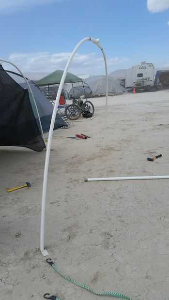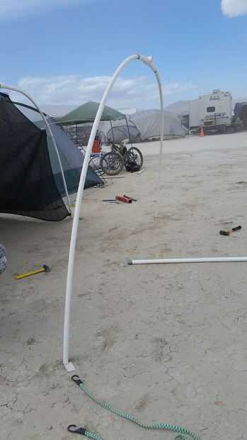 Encaja las longitudes de 10' 2.5' longitud con un conector T para uno de los extremos. Coloque un lado de la tubería de 10' en una de las apuestas de barra de refuerzo en la esquina. Que alguien sostenga hay y doble el tubo sobre un arco y deslizar la otra 10' longitud sobre el juego de barras de refuerzo. Ahora debe tener un arco con el conector T en el medio. Repita este proceso con la siguiente "costilla" del PVC con el conector de X, luego conecte las dos costillas con una de las 5' longitudes de PVC y asegúrelo con una cuerda del amortiguador auxiliar.