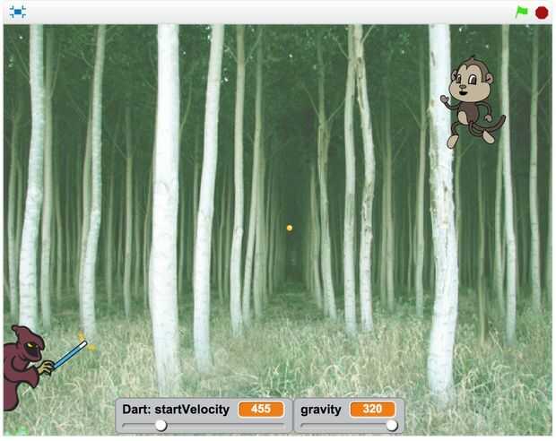 También junté la simulación en cero, un arrastrar y soltar programación ambiente hecho por el MIT Media Lab. En la versión de Scratch, puede arrastrar los controles deslizantes para cambiar la gravedad y la velocidad del proyectil para ver cómo afectan la simulación. Compruébelo aquí.