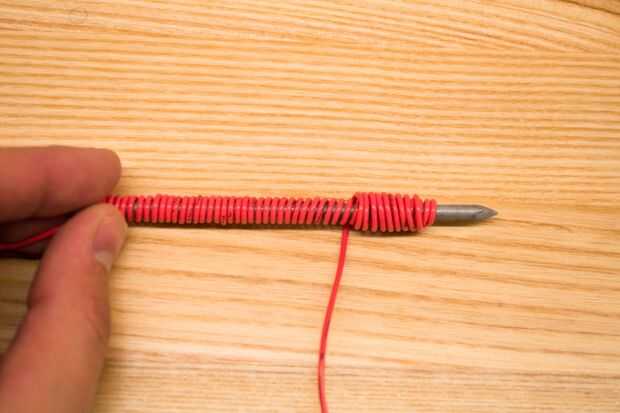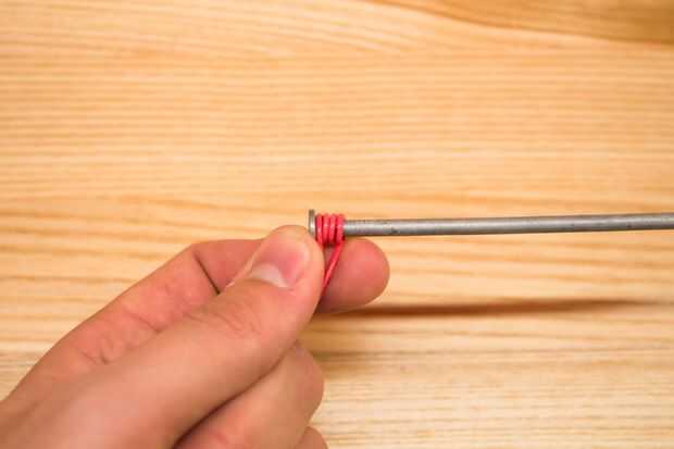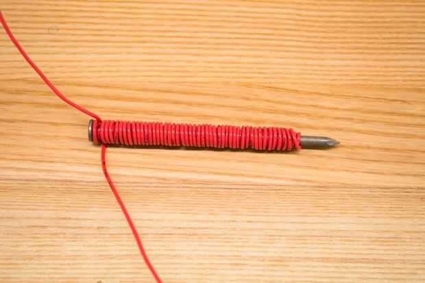 Utilizaremos un electroimán para sostener nuestro Monkey y liberarlo en el momento adecuado. Un electroimán hace de bobinas de alambre envuelto alrededor de un núcleo de metal. Como actual a través del cable, es magnetizar el núcleo de metal. Usaremos alambre de embalaje 30-gauge (o menor) o alambre magneto para crear nuestro. Me olvidé de tomar fotos mientras esté con mi cable de calibre 30, por lo que las imágenes me muestran hacerlo con alambre calibre 22. No lo hago con alambre de calibre 22, como va a ser difícil obtener suficiente resistencia para trabajar con un adaptador de CC a un precio razonable. El proceso es el mismo, pero te envuelve más veces con el 30-indicador menor.