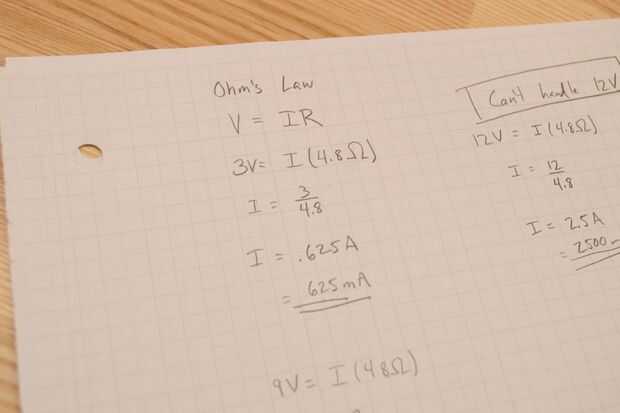 A 3V y 4.8Ω, el amperaje viene a 3V / 4.8Ω = .625A. Un amperio (A) es de 1000mA. Mayoría de los adaptadores DC lista el amperaje en mA, pero la unidad de QUE V/Ω es igual a un así que tenemos que multiplicar por 1000 para saber el valor de mA. En este caso 625mA es lo que nuestro circuito se dibujaría. Estaremos totalmente aceptables mediante el ajuste más bajo en mi adaptador como estamos clasificados a 2500mA y sólo dibujo 625mA.