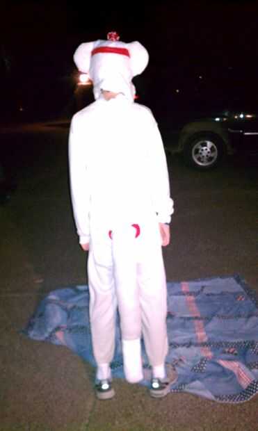 lo que necesitas es 3 pedazos de cartulina, algunos tablero de la espuma y 2 copas de café folgers latas, un maní de espuma y 3 colores de tela y si quieres algunos de malla para los ojos. Primero puse la cartulina en un círculo del tamaño que quiera