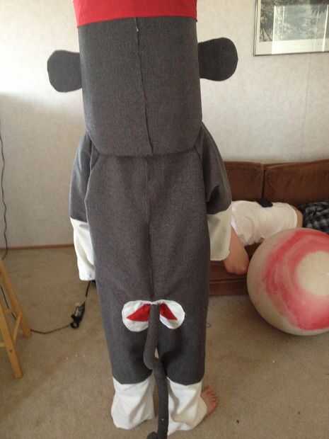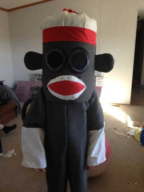 lo que necesitas es 3 pedazos de cartulina, algunos tablero de la espuma y 2 copas de café folgers latas, un maní de espuma y 3 colores de tela y si quieres algunos de malla para los ojos. Primero puse la cartulina en un círculo del tamaño que quieras la cabeza y con cinta entonces yo cortar 4 círculos en el tablero de la espuma del tamaño de la parte inferior y superior de la cabeza. Luego corte del centro de dos de ellos por lo que puede caber la cabeza a través de él. les pegan y los puso alrededor de 3 o 4" para arriba en parte por lo que tienes que cortar la cartulina para los hombros en el corte salidas. Luego hizo mi hijo trate para no los agujeros dónde cortar los agujeros para los ojos y cortar el ojo hacia fuera. Ahora poner la tela en todos lado pero superior (caliente pegado a mina pero puede pegar si no tienes pistola de pegamento caliente) sacó de la esponja de cacahuate y cortar por la mitad y pegar tela a él y pegado al lado de la cabeza para oídos. cortar centros fuera de las tapas del café y pegamento en malla y luego pegar en los agujeros de los ojos. Coge blanco o lo que cada color que desea para boca y recorte una boca y cola más abajo pero deje una abertura pequeña para rellenarlo que su elevada hacia arriba. sólo hacer sombrero y pegamento en. para el cuerpo acabo de hacer un mono grande para el cuerpo y coser una cola.
