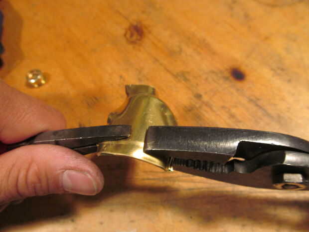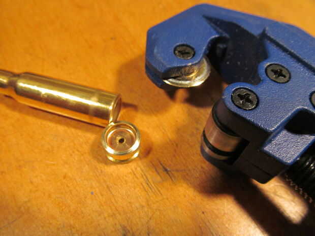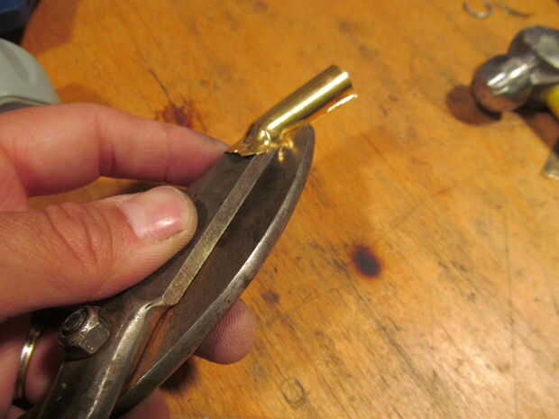 Utilice un cortador de tubo para quitar el final de la cartilla de la cáscara. Empiece a cortar la cáscara desde el lado de negocios con un par de tijeras de metal. Como cortar, utilice un martillo pequeño para aprovechar más la cáscara de los esquileos. Esto hace más fácil mover el corte a lo largo de la longitud de la cáscara.