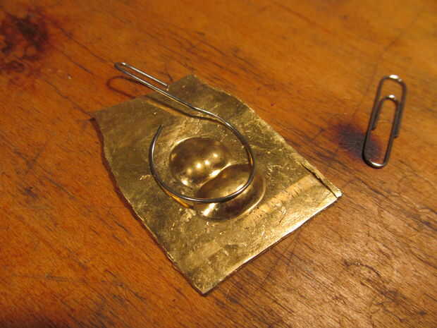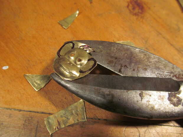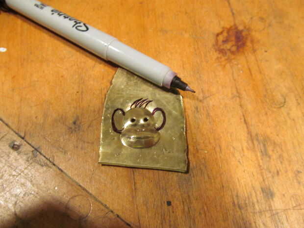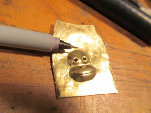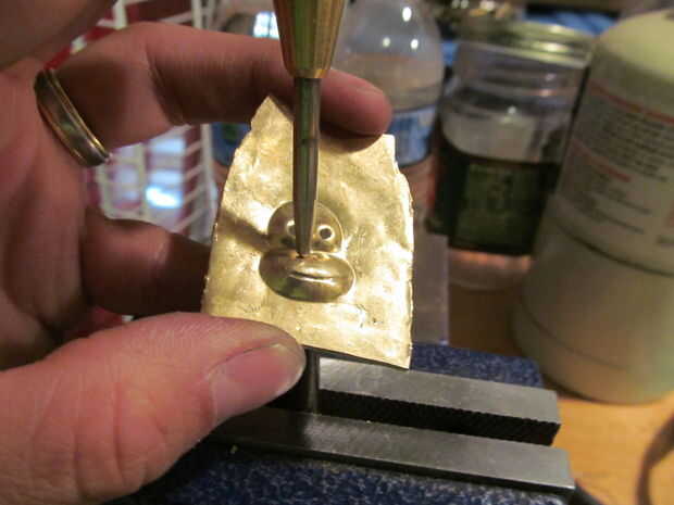 La sonrisa es hecha por un clip de grabación en relieve en el área de la boca. Alargar un clip y enróllelo alrededor de una toma de corriente. Una vez que tenga la curva cinta adhesiva en la cara. Use el yunque de golpe de la bola mientras que martillo en. Destacar la sonrisa con un grabador.
