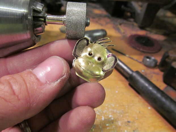 A continuación utilice un marcador permanente para dibujar las orejas y pelo. Utilice tijeras de metal para cortar hacia fuera. Forma de los bordes con un diamante de la rueda y hobby.
