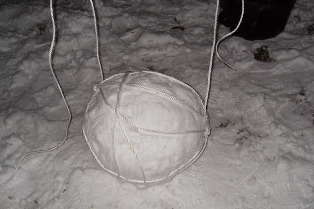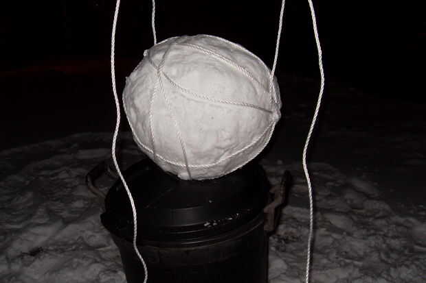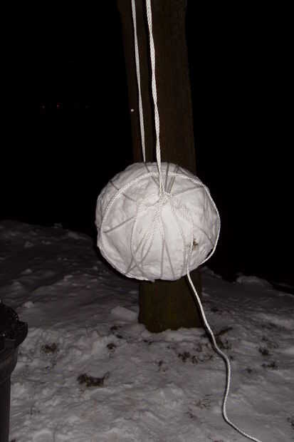 Mientras que la bola de nieve se apoya en su soporte, anudar la cuerda en el mismo punto de anclaje que utilizamos anteriormente. Tomar cualquier longitud queda y Envuélvala alrededor de la bola de nieve más. Esto agregará una pequeña ayuda extra, pero en su mayoría solo consigue el cable fuera del camino.