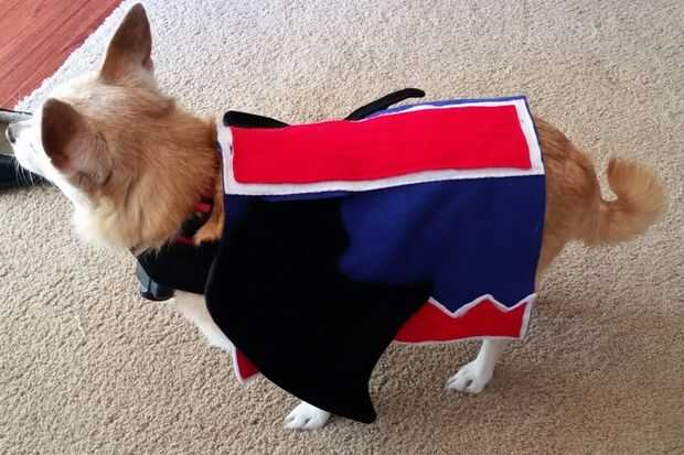 Para completar la chaqueta, coser la tira roja y blanca que corta para adaptarse a la parte posterior de su mascota. Otra vez el blanco va hasta el borde y hay una capa de ¼" entre el rojo y blanco, todo el camino alrededor. Cosí el rojo y la capa blanca por este tiempo, aunque no es necesario. También cosí una raya por el medio de la roja, sólo para añadir cierto estilo y hacerlo un poco más firme donde se ejecutará la correa.