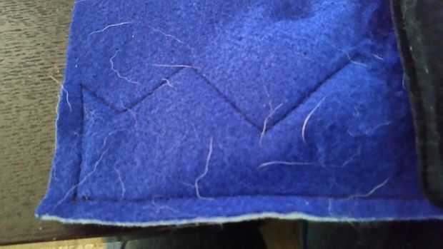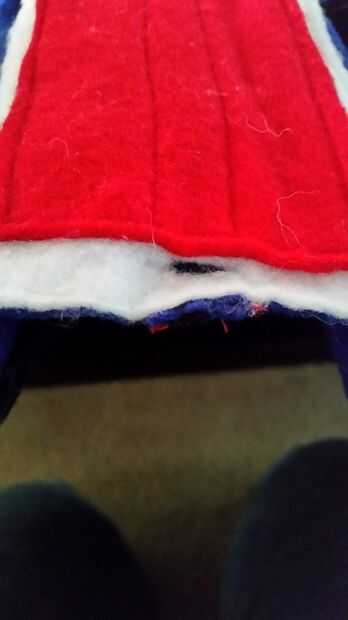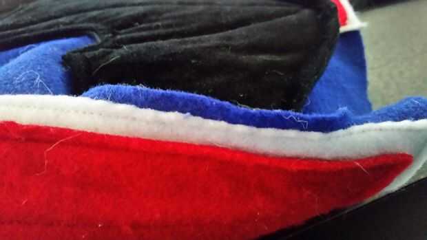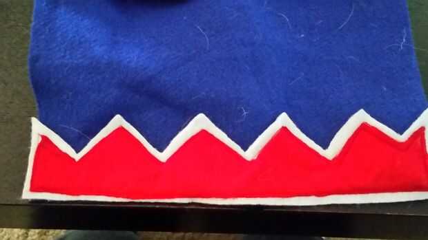 Lo bueno de fieltro es que no tienes a dobladillar los bordes. Sólo se puede cortar el fieltro y no funcionará, lo hará también parcialmente haciendo juntos palo más fácil de coser. Comienzan alineando las llamas rojas y blancas a la chaqueta azul. Estos se ejecutarán a lo largo de su mascota. No azul será visible en el fondo o lados de la chaqueta, el blanco cubrirá completamente el azul. Después de que el blanco está alineado por un lado, la línea de la red. El rojo debe cortarse para que un ¼" de blanco de muestra de todos los lados. Alinee el fieltro por consiguiente. Comience a coser alrededor de las llamas rojas, a través de todas las 3 capas de fieltro. No hay necesidad de coser el blanco y el rojo, coser todas las 3 capas a la vez. El blanco no fray.