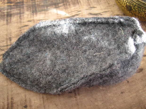 poner la suela fieltro en la parte superior de la zapatilla, pin para el borde de la zapatilla alrededor de la planta del pie dejando un espacio de 3 cm en el talón para el torneado de coser todo alrededor, otra vez he mina cosidos a mano en la parte posterior de la puntada.