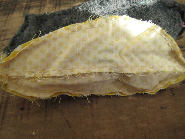 Prender juntos las piezas del oído con el algodón de la impresión en el interior y coser alrededor dejando la parte inferior abierta para dar vuelta. Repita de 4 espigas.