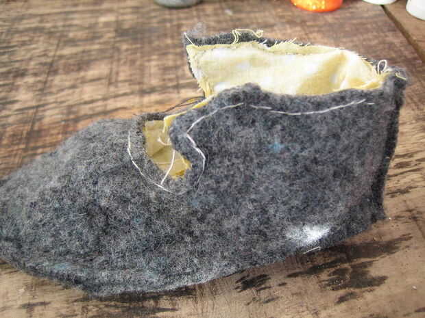 Prender juntos el fieltro zapatilla superior y forro, una vez más grabado en el interior, cosen las dos piezas juntas alrededor del borde superior de la zapatilla, he cosido a mano mis zapatillas, en la parte posterior de la puntada. Al llegar al tobillo insertar un lazo elástico (usado para cerrar la zapatilla) y coser en su lugar, coser alrededor del borde superior.