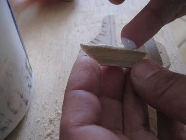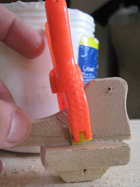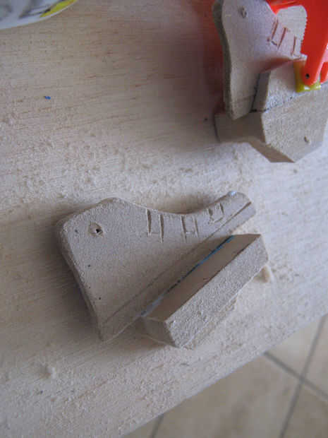 cortar un rectángulo de un ancho mdf y pegar las zapatillas del arlequin.