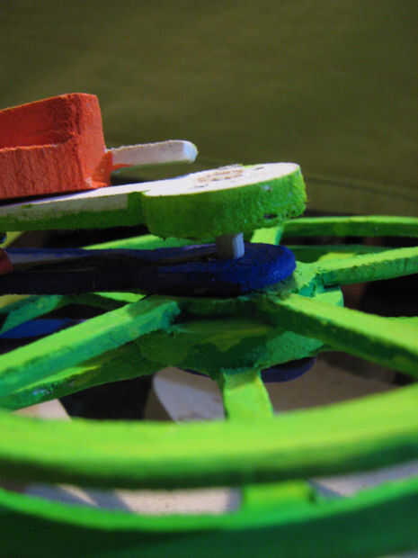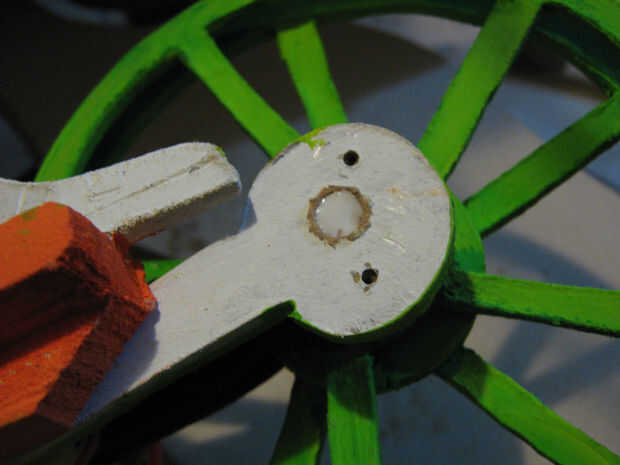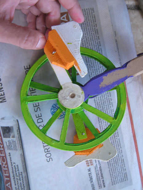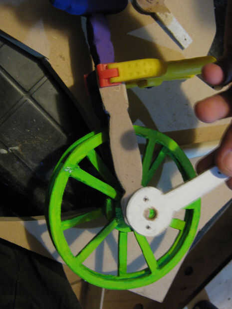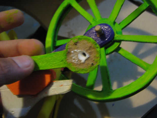 Hacer un agujero en cada centro de los ejes de pedal y pegarlos en ambos lados del centro de las ruedas, asegúrese de que las direcciones... uno va para arriba y otro abajo