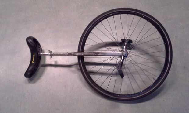 El monociclo está hecho de un viejo marco de monociclo (modificado), una vieja rueda de bicicleta, un centro de repuestos de monociclo y una silla por supuesto.