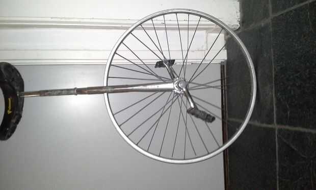 Tomamos una vieja rueda de bicicleta y sacó todos los radios, a continuación, ponemos los radios en el cubo del monociclo y comenzó a montar la rueda.
