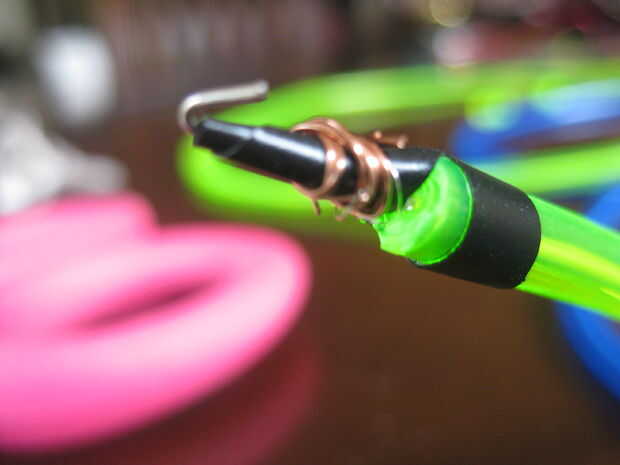 Entonces usted simplemente empalme los dos hilos EL color. Tengo 3 patas de color verde lima y 3 pies de cable EL azul. Suelde los cables del ángel (y sus anillos de cobre de la soldadura que os adjunto) de cada cable EL uno al otro. Y de la soldadura de la base de cobre de cada hilo EL uno al otro.