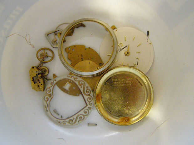 Sin embargo, una vez que se separe todas las partes, debe tener al menos dos piezas de cuero, una correa/Correa, dos placas metálicas llenas de orificios, algunos tornillos pequeños, un vaso, el dorso y la parte frontal del reloj, una perilla, un montón de dientes y algunas otras cosas. Suficiente material para trabajar con!
