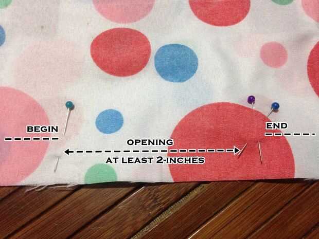 Coloque pasadores como una marca de guía para la apertura a la vuelta sobre la tela y el relleno de la fibra después de coser los lados.
