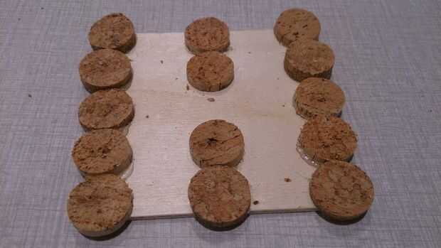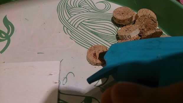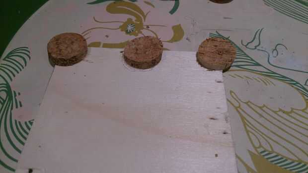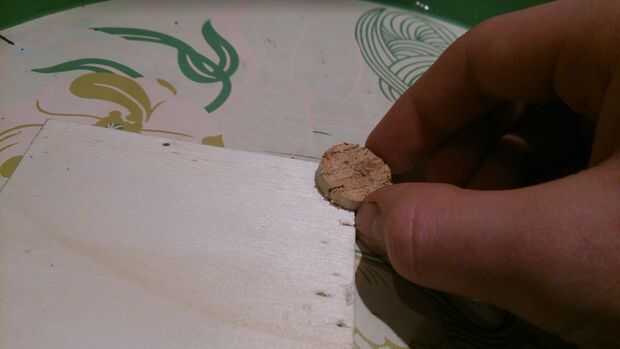 Poner una gota de pegamento sobre la madera y colocar un anillo de corcho sobre ella.