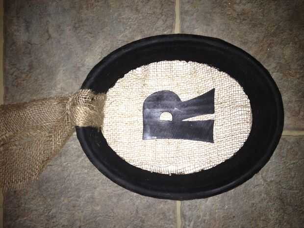 Usé la pistola de pegamento para fijar una "R" madera que compré en la isla de despacho en Wal-mart por $.25 y aerosol pintado con esa pintura en aerosol negro mismo.