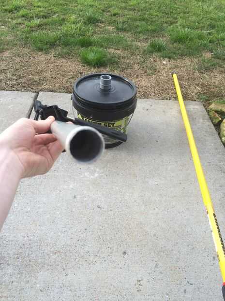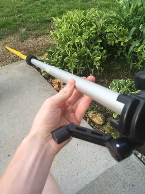 Se utilizó un trípode roto (el pedazo de centro) y un rodillo de pintura. Lo que hicimos fue pegamento la parte inferior del trípode en el rodillo de pintura por lo que es un gran poste. También es extensible