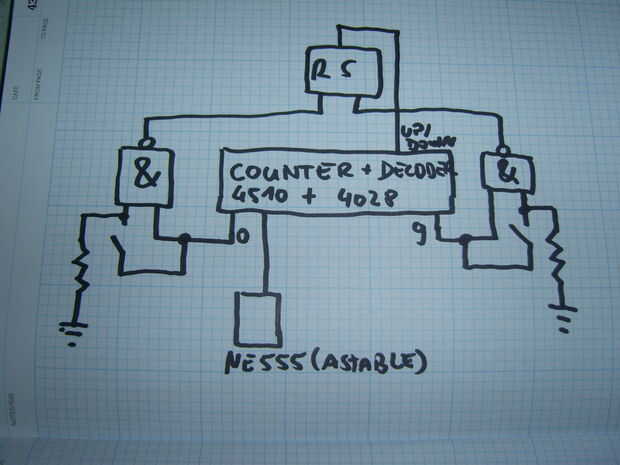 El último IC es una puerta del NAND 4011. Dos de las puertas NAND están conectadas como un fracaso de tirón de RS. Las entradas de las otras dos puertas NAND están conectadas a los botones y LED1 o LED10. Las salidas están conectadas al RS flip flop. Si pulsa el botón en el momento adecuado, lo que significa por ejemplo LED10 se ilumina, la salida de la NAND puerta envía una baja señal del fracaso de tirón que cambia su estado de salida (ej. de alto a bajo o viceversa). Esta señal va al pin 10 de 4510 para cambiar la dirección de la cuenta. La "bola" rebota.