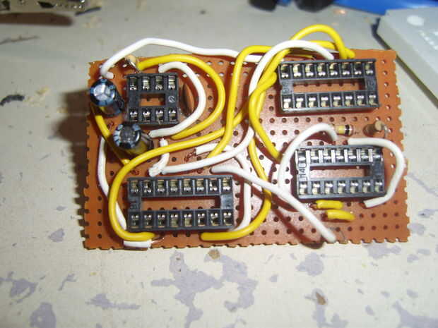Ahora es el momento para el ICs para unirse a la fiesta. Poner a las tomas. Poner la placa en la caja y alambre el pulsadores LEDs, potenciómetro, clip de batería e interruptor on-off. Otra vez: cuidadosamente comprobar cada uno de alambre! Es fácil cometer errores aquí.