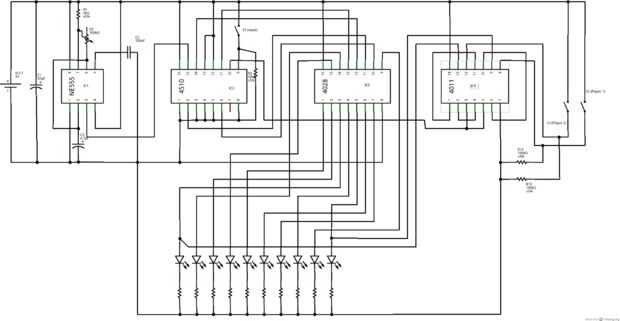 Hice algunas modificaciones en mi última versión: dejé el pulsador (S1) y el desplegable relacionados con resistenc, porque no es necesario para el juego. Simplemente conecté el pin de reset (9) a tierra. Yo también sustituir las resistencias limitantes actuales diez (al lado de los LEDs) con una sola. Uno es suficiente porque sólo un LED se enciende una vez.