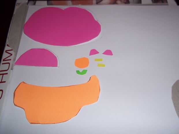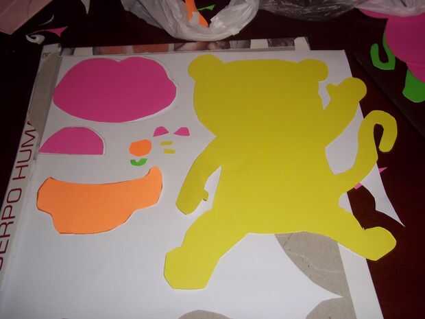 Según el tamaño que desee los monos tienen, hacer un patrón en una hoja de papel o cartón, esto le permitirá hacer muchos monos de un patrón. Dibujar y cortar cada patrón, (ya sea con el cuchillo xacto o tijeras lo que se adapte mejor para ti) hice la cara, el patrón del vientre y las orejas del mismo color, como el pañal y el chupete, dependiendo de la ocasión y edad del bebé/niño puede utilizar diferentes colores y mezclarlas.