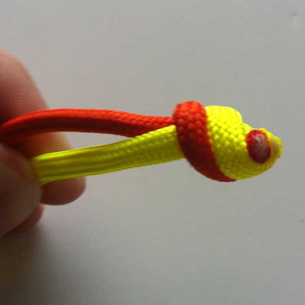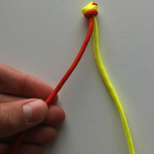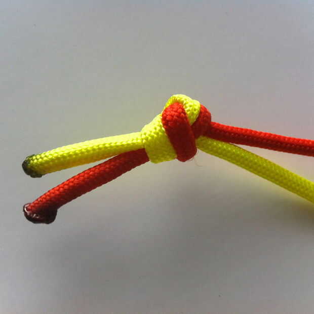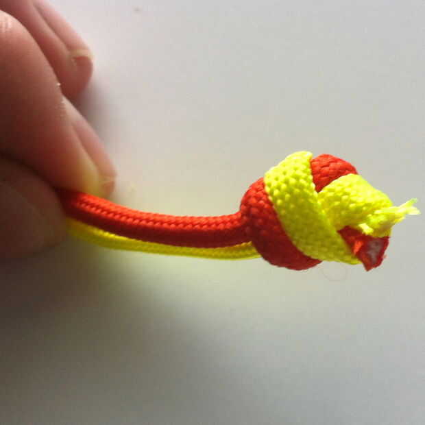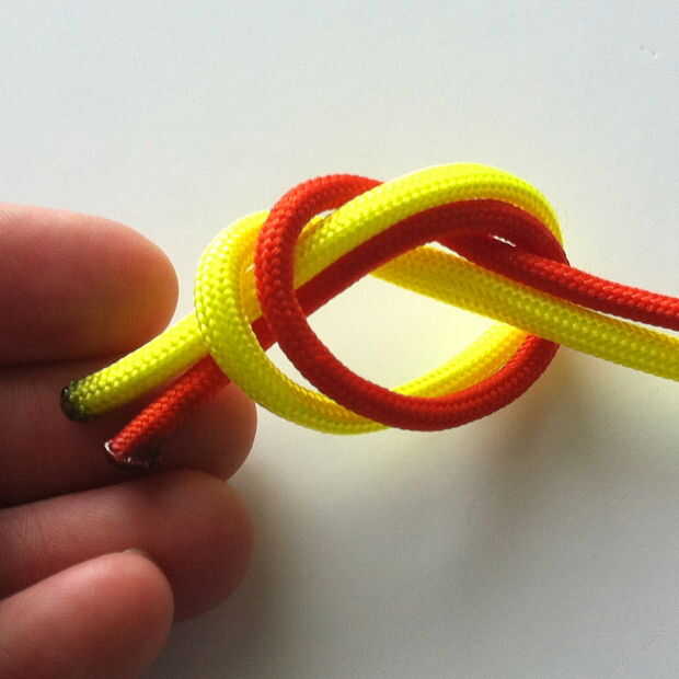 Empezar por atar las puntas de las dos cuerdas con un nudo. Apriete el nudo hasta que esté firme. Una vez hecho el ajuste, recorte de los extremos del cable sobre el nudo y les derrita con un mechero por lo que permanece y no desentrañar cuidadosamente.